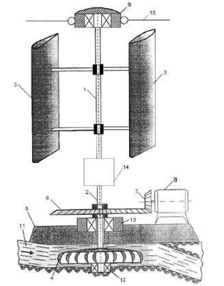 Ветрогидроэнергетическая установка имеет: вертикальный вал ветроэнергетической установки 1, вертикальный вал гидротурбины 2, рабочие лопасти ротора 3, гидротурбину 4, основание 5, шестерню передачи крутящего момента электрогенератора 6, шестерню сцепления 7, электрогенератор 8, верхнюю опору вала 9, растяжки 10, водогон 11, нижнюю опору 12, дополнительную опору 13, магнитопорошковую муфту 14, в состав которой входят: внешний корпус магнитопорошковой муфты 15, магнитный порошок 16, внутренний корпус магнитопорошковой муфты 17, катушка 18, корпус катушки 19, шаровая опора 20, шариковый подшипник 21.