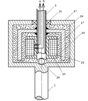 Принцип действия ветро- и гидроэнергетической установок достаточно известный, потому основное внимание будет уделено разъединению и объединению валов ветро- и гидроэнергетических установок с помощью магнитопорошковой муфты 14. При отсутствии питания катушки 18, которое подается от источника питания Un (см. рис. 2) через контакты а и б вертикальный вал ветроэнергетической установки 1 и вертикальный вал гидротурбины 2 не имеют жесткого соединения. Это обусловлено тем, что частицы магнитного порошка, не будучи намагниченными, не имеют между собой связи. Т. е. вертикальный вал гидротурбины 2 свободно вращается вокруг вертикального вала ветроэнергетической установки 1, что обеспечивается наличием шарикового подшипника 21 и шаровой опоры 20.