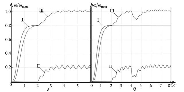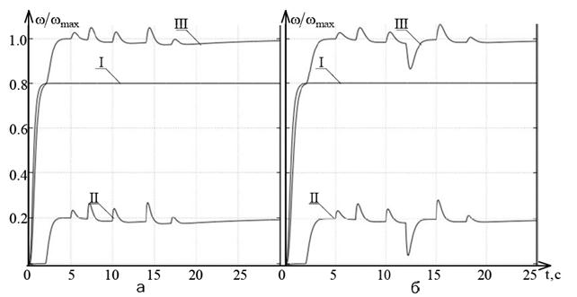 Рисунок 7 Результаты моделирования СУ ВГЭУ с магнитопорошковой муфтой для скачкообразного изменения ветра во временной области,