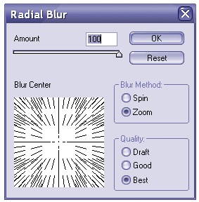 Применяем фильтр Filter>Blur>Radial blur с установками: