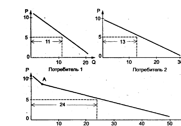 Рыночная кривая спроса имеет излом в точке А, так как именно в этой точке при цене в 9 руб. на рынок выходит потребитель 2. При более высоких ценах объем спроса потребителя 2 равен нулю и весь рыночный спрос формируется потребителем 1.