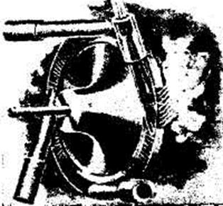 (рис. 1). Усилия, вызванные поворотом струи пара в каналах рабочей решетки, вращают диск и связанный с ним вал турбины. Отличительной особенностью этой турбины является то, что расширение пара в соплах от начального до конечного давления происходит в одной ступени, что обусловливает очень высокие скорости потока пара. Преобразование кинетической энергии пара в механическую осуществляется без дальнейшего расширения пара лишь вследствие изменения направления потока в лопаточных каналах.