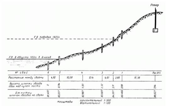 Результатом выполнения работ по устройству гидрологического поста является профиль поста с указанием номеров свай и реперов, их расстояния от постоянного начала (ПН), отметок в выбранной системе высот и приводок каждой сваи (рис. 2). Кроме того, на каждый гидрологический пост заводится «Техническое дело поста».