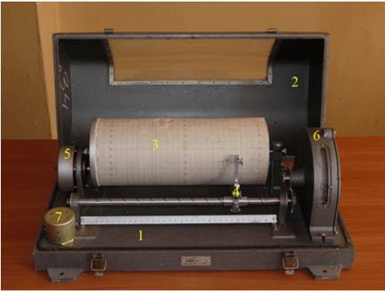 Рис. 4. Самописец уровня воды ГР-38: 1 – корпус; 2 – крышка; 3 – барабан с лентой; 4 – каретка с пером; 5 – часовой механизм; 6 – корпус шкива с тросом; 7 – коробочка с осушителем воздуха.