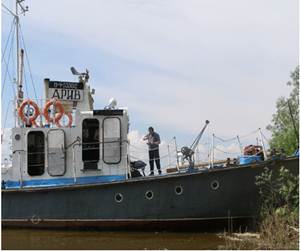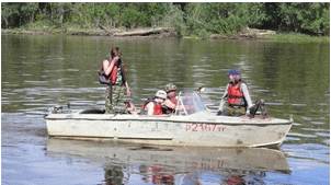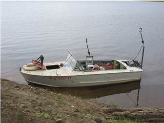 Рис. 9. Гидрометрическое судно (моторная лодка «Прогресс» с лодочным мотором «Вихрь-30», оборудованное механическим лотом (лебедка «Нева»), ручной якорной лебедкой.