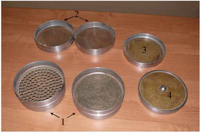 Рис. 26. Грунтовые сита: 1- штампованные с круглыми отверстиями; 2 – из медной сетки; 3 – поддон; 4 – крышка
