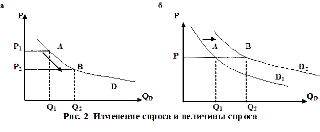 Если все факторы, кроме цены зафиксированы (т.е. неизменны), то при изменении цены происходит изменение объема спроса. Графически это выражается движением (как бы скольжением) по линии спроса (Рис. 2 а).