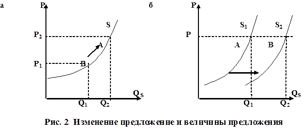 Если все факторы, кроме цены зафиксированы (т.е. неизменны), то при изменении цены происходит изменение объема предложения. Графически это выражается движением (как бы скольжением) по линии предложения (Рис. 2а).