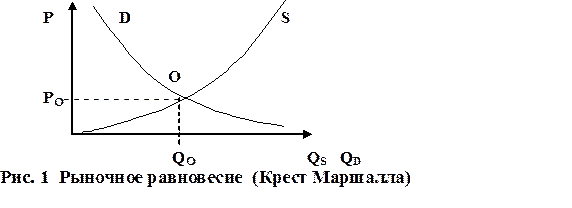 Рыночное равновесие (точка О) - это состояние рынка (Рис.1), при котором объем спроса равен объему предложения, т.е.