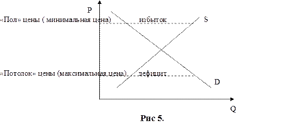 - когда равновесные цены представляются обществу слишком низкими, тогда законодательно устанавливаются цены выше равновесных (минимальная цена, «пол» цены)