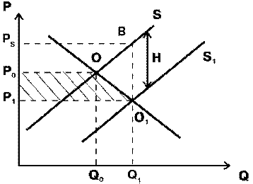 Субсидия (Н) вызывает понижение кривой предложения из положения S в положение S1. Тем самым возникает новая точка равновесия О1 и соответствующие ей равновесная цена Р1 и равновесный объем Q1. Очевидно, что общая сумма затрат государства на субсидии составит произведение Q1Н или (на графике) площадь прямоугольника Р1О1ВРS.
