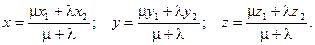 Если точка М(х, у, z) делит отрезок АВ в соотношении l/m, считая от А, то координаты этой точки определяются как: