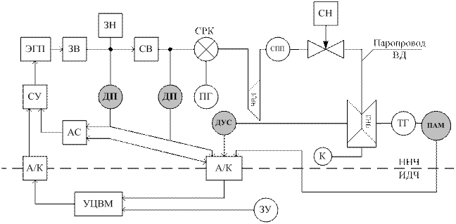 ЗН – золотник СН; СРК – стопорно-регулирующий клапан; ПГ – парогенератор; ЧВД – часть высокого давления парового тракта турбины; СПП – сепаратор-прогреватель; ОК – отсечной клапан; ЧНД – часть низкого давления;