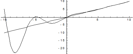 Вообще говоря, кривая, неограниченно приближаясь к своей асимптоте, может и пересекать ее, причем не в одной точке, как показано на приведенном ниже графике функции
