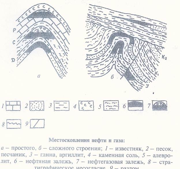 Под местоскоплением нефти и газа понимают совокупность залежей (реже одна залежь), приуроченных к одной или нескольким ловушкам, находящихся в пределах одной локальной площади. На рис. 4. Приведено строение 2-х местоскоплений нефти и газа, связанных с одной (а) и несколькими (б) ловушками.