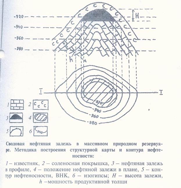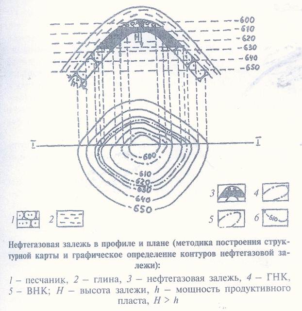 При расчете контуров залежи нефти и газа по результатам разведки обязательно выполняются геологические построения: структурные карты и геологические профили. Обычно на разведочной площади бурят ряд скважин по профильной системе, затем строят геологические профили, на которые наносят результаты опробывания продуктивных пластов. По геологическим профилям строят структурную карту, на которой показывают контуры нефтеносности и газоносности. В обычных условиях поверхности, отделяющие нефть от воды, газ от нефти или газ от воды, являются практически горизонтальными (на одних абсолютных отметках). Поэтому, контуры нефтеносности и газоносности проводят в соответствии с конфигурацией изогипс пласта. На рисунке 5 приведен геологический профиль через нефтяную залежь, структурная карта нефтяного пласта, а также методика построения структурной карты и определение контуров нефтегазовой залежи.