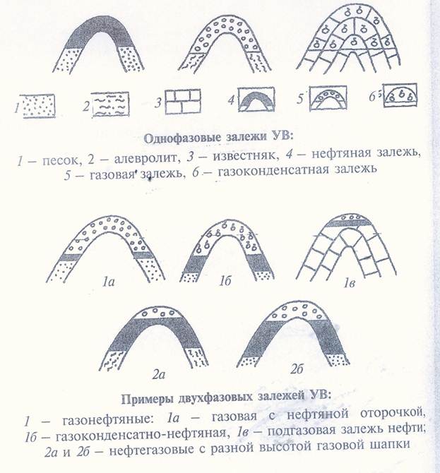 На рисунках представлены сводовая нефтегазовая залежь на антиклинали простого строения (без нарушений) и сводовая нефтяная залежь, связанная с куполом, нарушенным сбросом, а также сводовые залежи, различающиеся по фазовому состоянию (однофазовые и двухфазовые).