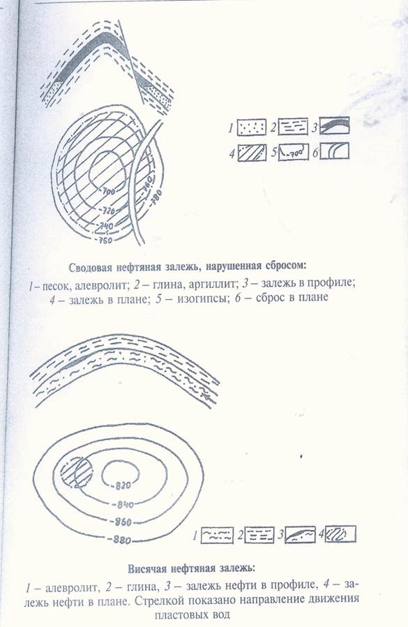 Нефть и газ в сводовых залежах обнаруживаются в самых приподнятых частях ловушек. В плане (на структурной основе) форма таких залежей, как правило, овальная или округлая и соответствует форме ловушки.