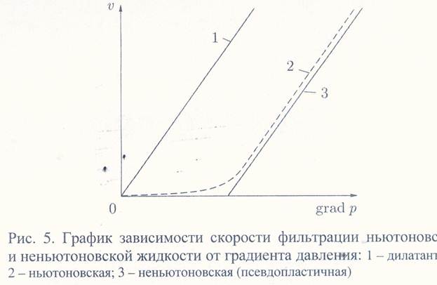 Однако не редко, когда на нефтяных месторождениях при их разработке нарушается прямолинейный закон трения Нъютона. В этих случаях зависимость скорости фильтрации от градиента давления имеет вид кривой, проходящей через начало координат выпуклостью к оси градиента (рис. 9, линия 2). Такие жидкости обладают структурно- механическими свойствами и называются ненъютоновскими (вязкопластичными). Основным показателем ненъютоновских свойств при фильтрации нефти (жидкости) в пористой среде является предельный (начальный) градиент давления (рис. 9. Крив 3), после превышения которого начинается движение нефти (жидкости) в горной породе.
