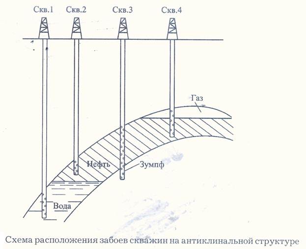 На антиклинальной структуре призабойная часть скважины может иметь разную конструкцию и разное положение относительно пласта-коллектора рис 16.