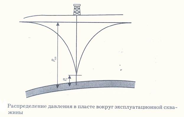 Линия изменения давления показывает, что в процессе эксплуатации скважины вокруг нее образуется воронка депрессии, в пределах которой градиент давления резко возрастает по мере приближения к скважине.
