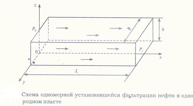 Реальные коллекторы нефти имеют сложное строение, поэтому для моделирования фильтрационных течений используют упрощенные постановки краевых задач. В наиболее простых постановках рассчитывают одномерные установившиеся течения в однородном недеформируемом пласте (коллекторе). В более сложных случаях учитывают сжимаемость добываемой нефти и продуктивного пласта.В случае одномерного течения скорость фильтрациинефти, расход и давление в разрабатываемом пласте Являются функциями только одной координаты.