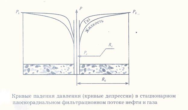 Обе ыормулы эквивалентны, из них следует, что давление в пласте распределяется по логарифмическому закону. На участке потока, близком к контуру питания, скорость фильтрации мала, и давление в потоке нефти падает незначительно. По мере приближения к добывающей скважине скорость фильтрации возрастает, а давление резко изменяется (рис. 23)