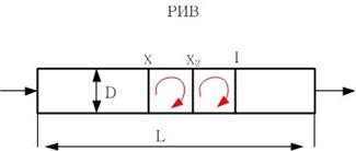 4. можно выделить бесконечное множество бесконечно малых поршней (участков, реагирующей среды с диаметром равным диаметру реактора и бесконечно малой длиной l. Каждый участок реакционной смеси двигается в направлении оси потока, выталкивая впереди идущий участок, но с ним не смешивается. Нет перемешивания в направлении оси потока, а химическая реакция протекает из-за того, что в границах между слоями разрешено радиальное перемешивание и в границах этого слоя параметры одинаковы, а степень изменения параметров зависит от времени нахождения слоя в реакторе.