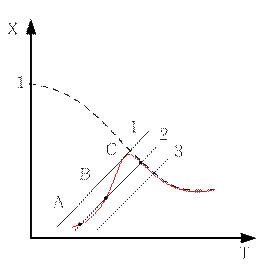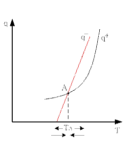 Если произошло незначительное кратковременное уменьшение температуры (TA смещено левее точки А), то наблюдается превышение тепловыделения над теплоотводом, и в результате система начинает сама себя разогревать. Следовательно, точка А - точка устойчивого стационарного состояния.