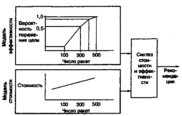 Модель состоит из двух частей — модели стоимости и модели эффективности. Эти модели используются для выбора военной системы с определенным числом ракет. Модель стоимости предс тавляет зависимость общей стоимости от количества ракет, а модель эффективности - зависимость вероятности поражения целей от количества ракет. Обе модели в данном случае можно рассматривать как объективные: они строятся на базе фактичес ких данных, надежного статистического материала. Однако выходные параметры этих моделей не объединяются посредств ом заданной зависимости; используется суждение руководителя, который определяет предельные значения стоимости, необх одимые значения эффективности. Часто используют отношение стоимости к эффективности, но при этом рекомендуется обращать внимание на абсолютные значения этих величин.