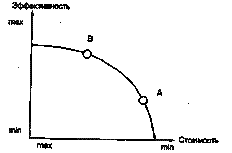 Третий подход к синтезу стоимости и эффективности при водит к построению множества Эджворта—Парето (рис. 3.2). Сравним два варианта на множестве Эджворта-Парето. Вариа нт А менее дорогой, чем вариант В, но и менее эффективный. Вариант В более эффективный, чем вариант А, но и более дор огой. Сравнивая варианты, находящиеся на множестве Эд жворта—Парето, ЛПР останавливается на одном из них и делае т свой окончательный выбор.