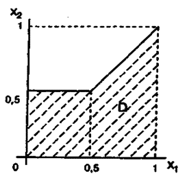 Приведем иллюстративный пример: построим нарочито простую модель с двумя параметрами и двумя критериями. Из множества переменных, описывающих экономическую систему современного государства, выберем два: X 1 - увеличение объема де-нежной массы; X 2 — увеличение количества рабочих мест. Предположим, что определенн ое количество рабочих мест может быть создано без увеличения объем а денежной массы, но дальнейшее их увеличение пропорционально объему денежной массы (рис. 3.3). На рисунке заштрихованная обл асть D может быть названа облас тью допустимых значений парам етров (X 1 и X 2 изменяются от 0 до 1).
