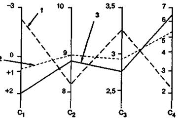 Варианты экономической политики, представленные в табл. 3.1, показаны также на рис. 3.5, где шкалы критериев пос троены от лучших (нижних) к худшим (верхним) значениям.
