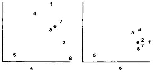 На рис. 11.1,а представлены первоначальные результаты проецирования на плоскость точек, характеризующих членов комиссии, при использовании расстояний между их оценками объектов. Рисунок показывает намечающееся единство большой группы членов комиссии (семь из восьми), причем три из них (3, 6, Т) образуют плотную группу. Далее было осуществлено «слияние» оценок объектов по критериям - результат представлен на рис. 11.1,0. При этом было достигнуто практически полное совпадение мнений большинства членов комиссии. Этот результат был доложен консультантом перед началом обсуждения работ, представленных на конкурс. Было сообщено также, что лишь один член ГПР (5) расходится во мнении с остальными в оценке четырех объектов по трем критериям. При обсуждении удалось убедить его пересмотреть первоначальные оценки. Обсуждение продолжалось значительно меньшее время, чем аналогичные заседания подобных комиссий, причем было принято намечавшееся решение большинства.