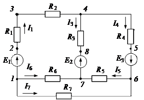 1 – 7, 1 – 6 – ветви; 1 – 4 – 7 – 1, 7 – 4 – 6 – 7; 1 – 7 – 6 – 1 - независимые контуры