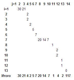 Сначала определим минимально допустимое время выполнения всех работ, т.е. продолжительность критического пути. Для этого составим матрицу от начального к завершающему событию.