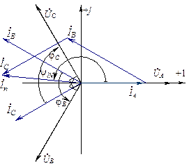 Векторная диаграмма несимметричного трехфазного приемника, включенного в четырехпроводную систему