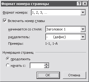 При установленном флажке Включить номер главы добавляется обозначение текущей главы. В этом случае становятся доступны поля начинается со стиля и разделитель. В поле начинается со стиля нужно указать вариант заголовка, по которому будут распознаваться главы при нумерации страниц.