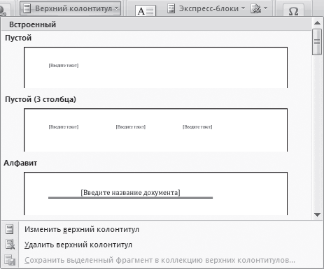 В Word 2007 можно вставлять колонтитулы. Для этого на вкладке Вставка предназначены кнопки Верхний колонтитул и Нижний колонтитул. При нажатии каждой из этих кнопок открывается меню, в котором выбирается вид помещаемого объекта (рис. 2.32).