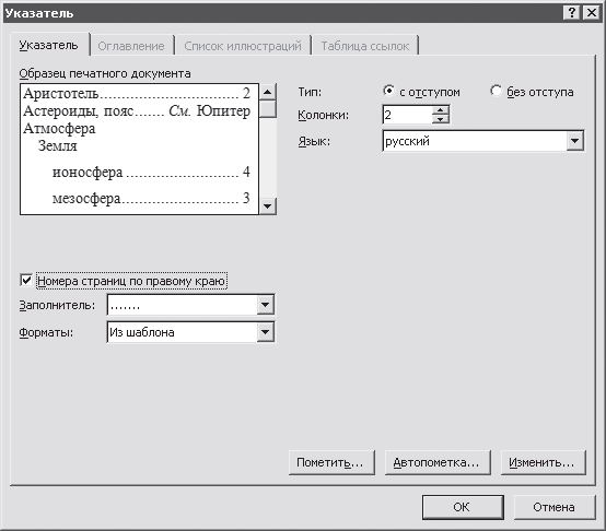 После нажатия в окне Указатель (см. рис. 2.46) кнопки ОК предметный указатель будет автоматически сформирован в том месте документа, где находится курсор. При этом будут сохранены его настройки (далее они будут предлагаться по умолчанию). С помощью кнопки Отмена осуществляется выход из данного режима без сохранения изменений.