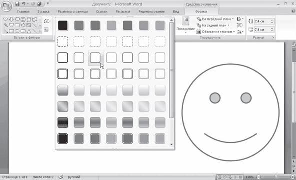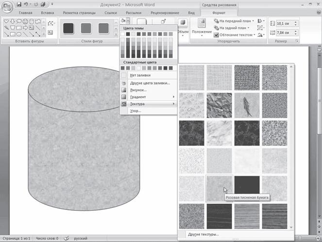 В Word 2007 содержится около 80 стилей для фигур. Если вы не найдете среди них нужного вам, то можете выбрать цвет, заливку, толщину контура фигуры и т. д. самостоятельно с помощью команд меню кнопок Заливка фигуры и Контур фигуры, которые также находятся в группе Стили фигур. Например, в меню кнопки Заливка фигуры есть команда Текстуры, с помощью которой можно выбрать текстуру для фигуры (рис. 6.14).