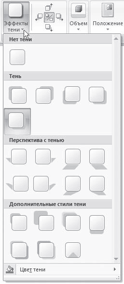 Кнопка Эффекты тени в одноименной группе на вкладке Средства рисования → Формат позволяет включать отображение тени. При нажатии данной кнопки появляется список доступных вариантов (рис. 6.15). С помощью команды меню Цвет тени можно выбрать цвет тени. Группа кнопок, расположенных рядом, позволяет изменять положение тени.
