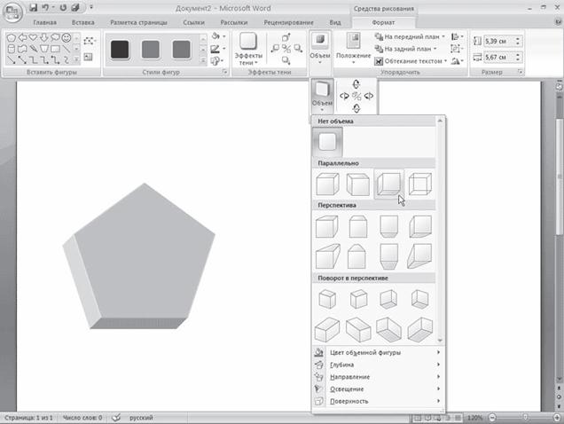Группы Объем отвечают за выбор объемных эффектов для выделенного объекта (данная настройка недоступна для некоторых фигур). Эффект можно выбрать из списка кнопки Объем (рис. 6.16), а затем настроить его параметры: цвет, глубину, направление, освещение объекта и тип поверхности.