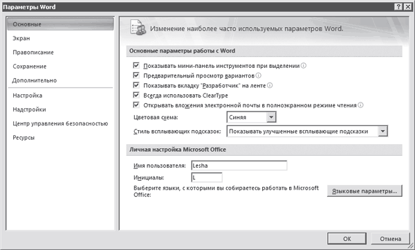 Поскольку режим настройки Word 2007 включает в себя большое количество параметров, целесообразно рассмотреть только наиболее важные, знакомство с которыми желательно для каждого пользователя.