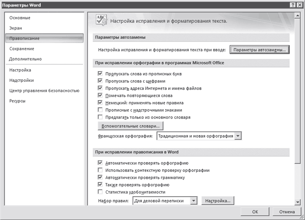 В программе Word реализованы возможности тонкого изменения параметров правописания. Для этого нужно в настройках программы открыть раздел Правописание, содержимое которого показано на рис. 3.3.
