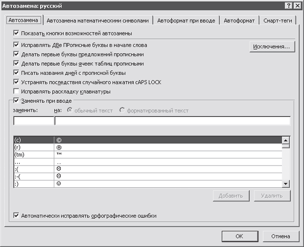 Для перехода в режим настройки автозамены следует в разделе Правописание нажать кнопку Параметры автозамены. При выполнении данной команды открывается окно, изображенное на рис. 3.4.