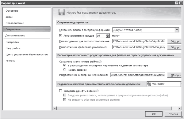 Поскольку в программе Word 2007 возможно сохранение документов в разных форматах, то для его настройки предусмотрен отдельный раздел, содержимое которого представлено на рис. 3.6.