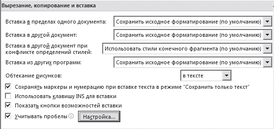 В полях Вставка в пределах одного документа и Вставка в другой документ определяется порядок форматирования при помещении текста из буфера обмена в тот же документ, из которого он был скопирован, и в другой документ соответственно. Требуемое значение выбирается из раскрывающегося списка. Для каждого поля возможны варианты – Сохранить исходное форматирование (по умолчанию), Использовать форматирование конечного фрагмента и Сохранить только текст. Аналогичным образом в поле Вставка из других программ выбирается порядок форматирования при помещении текста из буфера обмена, куда он был помещен из другой программы.