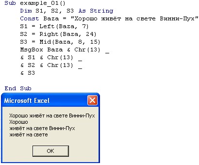 Иногда возникает необходимость разбиения строки на составляющие части. В VBA эту задачу решают три функции: Left, Right, Mid.
