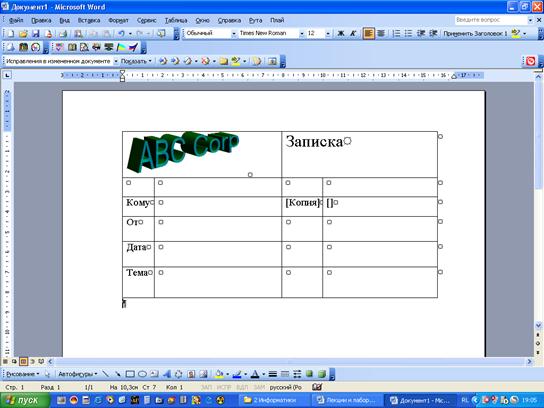 Элементы, входящие в состав заголовка документа, необходимо вводить в таблицу; ширина колонок таблицы подобрана так, чтобы выполнялись соответствующие требования к шаблону. Область для ввода информации в поле Копия создана путем объединения нескольких ячеек.